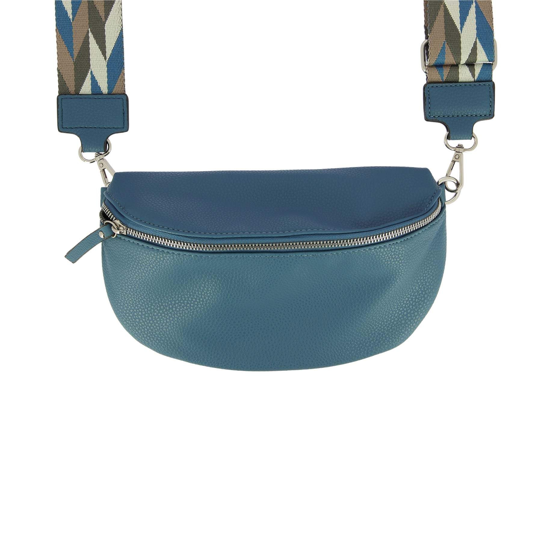 Ľadvinka Paola z džínsovej modrej farby : So svojím zaobleným tvarom a veľkým vnútorným vreckom na zips nahradí kabelku, aby ste mohli nosiť svoje malé veci štýlovo.  Odolný a umývateľný materiál – Zapínanie na dvojitý zips – látkový ramenný popruh.